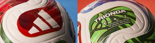这款官方比赛用球命名为“三重浪”(TRIONDA),名称取自英语“三”(Tri)与西班牙语“浪”(Onda),红、绿、蓝三色设计旨在向三大东道国致敬。